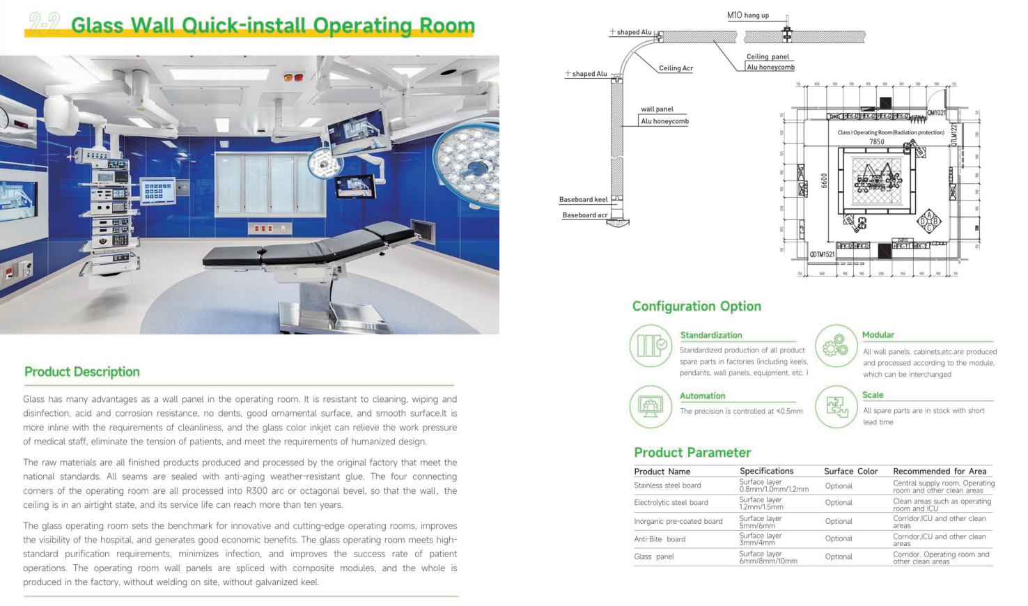 Raw materials are selected in line with national standards of the original factory production and processing of finished products, all joints are used anti-aging weather-resistant sealant sealant sealant, the operating room four sides of the connection Angle are processed into R300 arc or octagonal bevel excessive, so that the wall, ceiling in a state of air tight, its service life can reach more than ten years.